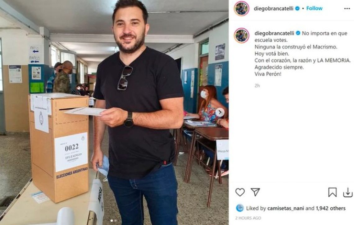 El primero en haber realizado su voto fue el periodista Diego Brancatelli, en la localidad de Pilar, quien aprovechó las redes sociales para manifestar su apoyo al oficialismo: “No importa en que escuelas votes. Ninguna la construyó el Macrismo. Hoy votá bien. ¡Viva Perón!”.