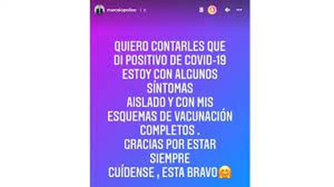 En una historia que publicó en su cuenta oficial de Instagram, el chimentero informó que está cumpliendo el protocolo de aislamiento «con algunos síntomas» pero con su «esquema de vacunación completo». También pidió a sus seguidores que se cuiden porque «está bravo».