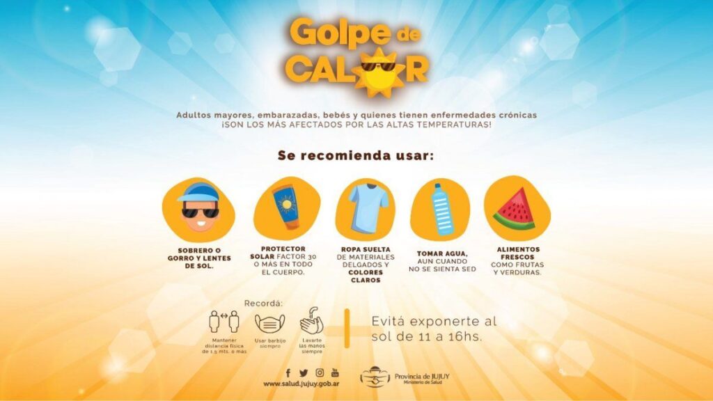 Mientras las previsiones del tiempo indican que continuarán las altísimas temperaturas en Jujuy, el Ministerio de Salud recuerda a la población las medidas de prevención, recordando que el golpe de calor es el aumento de la temperatura del cuerpo como consecuencia del exceso de calor en el que se pierden agua y sales esenciales para el buen funcionamiento del organismo.