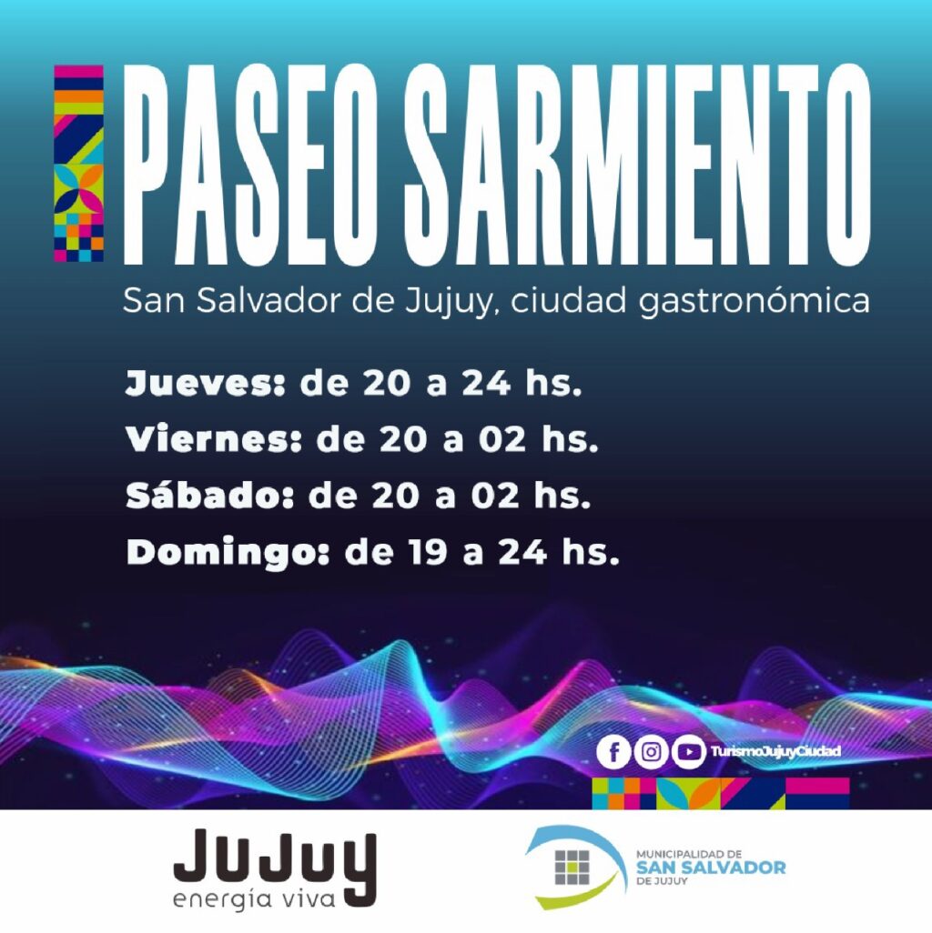 Este nuevo paseo gastronómico es una estrategia público-privada con la que se busca generar un nuevo corredor turístico en un espacio peatonalizado durante los fines de semana. De esta manera, el nuevo “Paseo Sarmiento”, abrirá las puertas a los vecinos y visitantes a partir del día jueves 17 en el horario de 20 a 24 hs, en tanto, el viernes 18 y sábado 19, con horario especial, se prolongará de 20 a 02 hs, para finalizar el día domingo 20 en el horario que ya es un clásico de 19 a 24 hs.