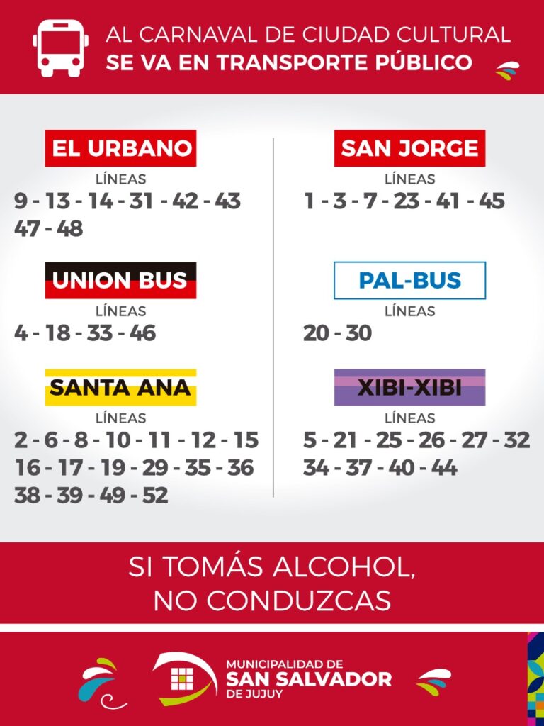 En lo que respecta al 26, 27 y 28, con la realización del Carnavalódromo, el servicio del transporte urbano de pasajeros iniciará desde 14 hasta las 02 horas. Este servicio extraordinario se reanudará a las 5 am, del día siguiente, hasta la finalización del evento.