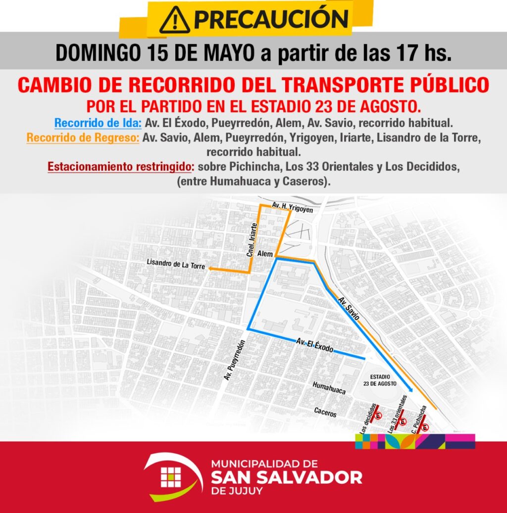 La Secretaría de Servicios Públicos, a través de la Dirección de Tránsito y Transporte, informa a la población en general y a los señores usuarios del transporte urbano de pasajeros en particular que, en virtud del encuentro deportivo entre el Club Atlético Belgrano de Córdoba y Gimnasia y Esgrima de Jujuy, que se llevará a cabo el domingo 15 en el estadio “23 de Agosto”, las unidades del transporte urbano de pasajeros que circulen por inmediaciones al mencionado predio deportivo, modificarán su recorrido, a partir de horas 17.