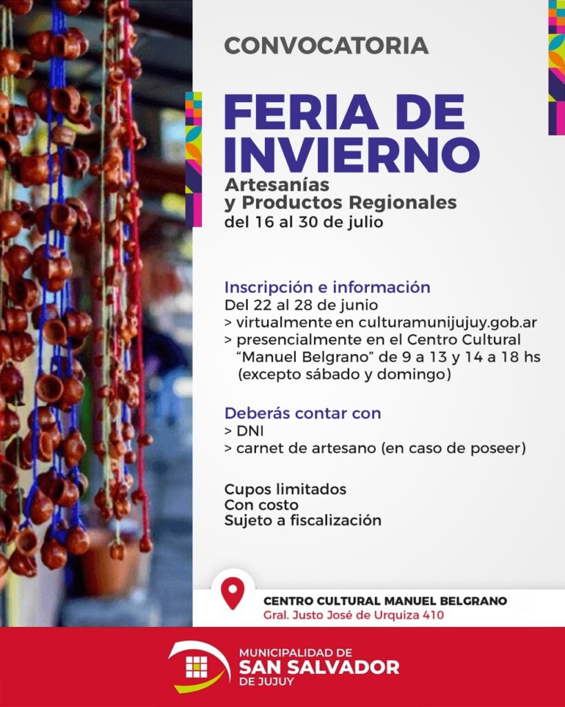 En el marco de la Temporada Turística Invernal 2022 del 16 al 30 de julio, se desarrollará en nuestra ciudad la tradicional La Feria de Invierno, por ello se abre la convocatoria para los artesanos y emprendedores que quieran ser parte. Los interesados pueden inscribirse, desde el miércoles 22 hasta el martes 28 de junio, de 9 a 13 y de 14 a 18 horas, en el Centro Cultural ‘Manuel Belgrano’ o virtualmente, ingresando a http://culturamunijujuy.gob.ar/feria-de-invierno-de-artesanias-y-productos-regionales/