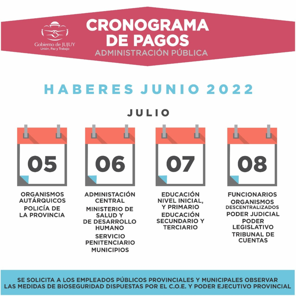 El Gobierno de Jujuy dio a conocer el cronograma de pagos de los haberes del mes de junio para la Administración Pública Provincial.
