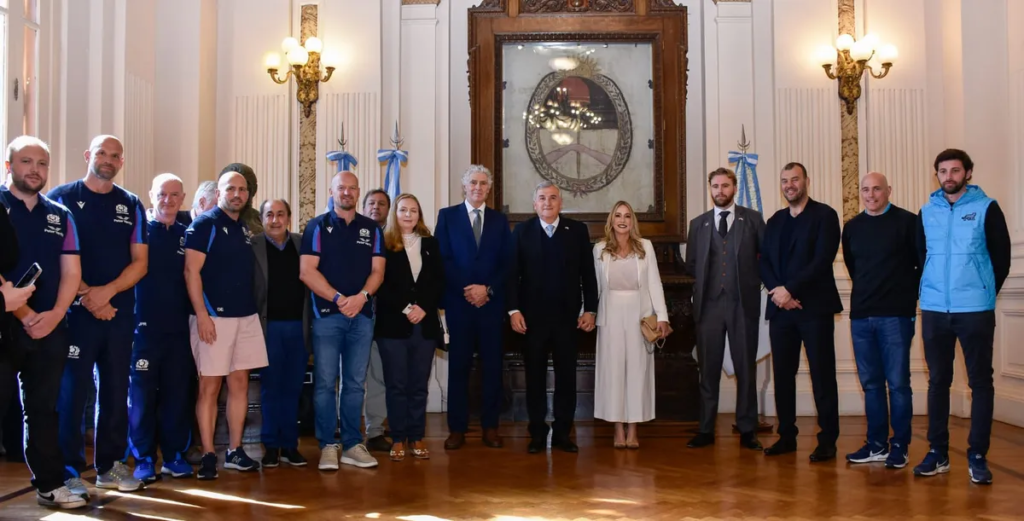 El gobernador de la Provincia, Gerardo Morales, y su señora esposa, Tulia Snopek, en el histórico Salón de la Bandera de Casa de Gobierno recibieron la visita de integrantes de los cuerpos técnicos de los seleccionados de rugby de Argentina y Escocia, equipos que se enfrentarán el sábado próximo en el primer test match a disputarse en Jujuy.