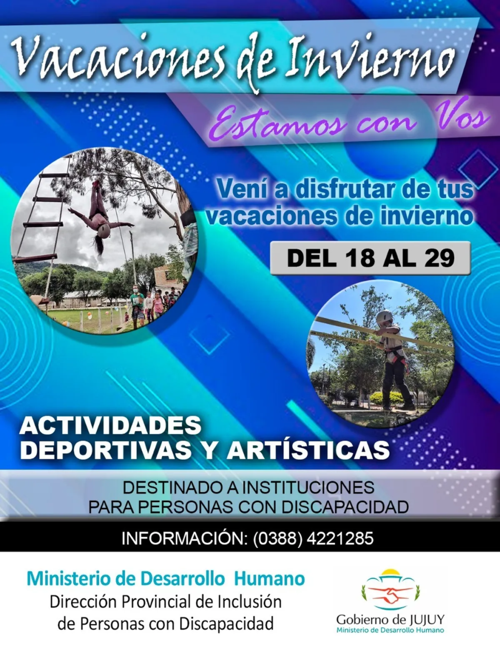 El Ministerio de Desarrollo Humano a través de la Dirección Provincial de Inclusión de Personas con Discapacidad, realizará durante las Vacaciones de Invierno 2022 con actividades deportivas, artísticas y culturales destinadas a Instituciones de Personas con Discapacidad. Se realizarán en el Complejo Eva Perón desde el 18 al 29 de julio.