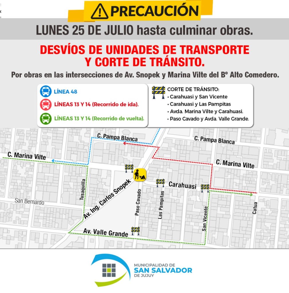 La Secretaría de Servicios Públicos, a través de la dirección de Tránsito y Transporte, informa a la población en general y a los señores usuarios del transporte urbano de pasajeros en particular, que debido a obras en las intersecciones de Av. Snopek y Marina Vilte en el barrio Alto Comedero, se procederá al desvío de las unidades del transporte además de cortes de tránsito según el siguiente esquema: