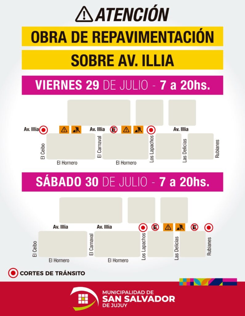 Las medidas están dispuestas para los días viernes 29 y sábado 30 de julio en el marco de las obras repavimentación que se ejecutan sobre avenida Illia del barrio Los Perales. Lo informó la Secretaría de Servicios Públicos de la Municipalidad de San Salvador de Jujuy, a través de la Dirección de Tránsito y Transporte.