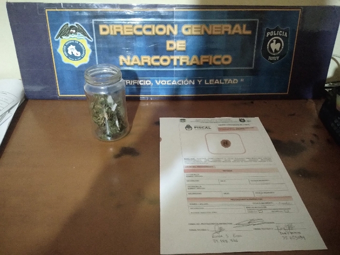 Atento los hechos, se procedió a la consulta con la Fiscalía Federal Jujuy, quien autorizo se realice la requisa correspondiente, encontrando un frasco con sustancias, que, tras realizar las pruebas de campo correspondientes, arrojo como resultado positivo de marihuana.