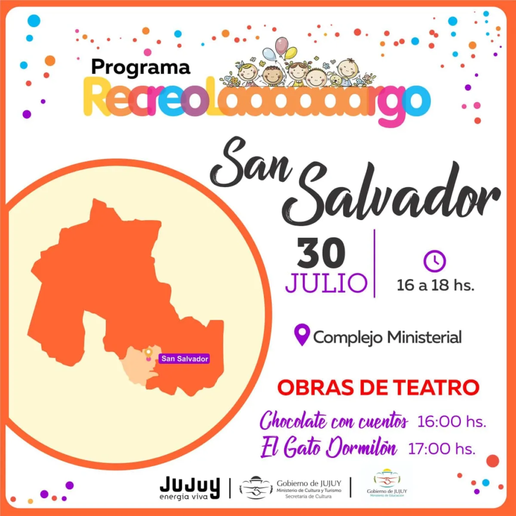 El gobierno de la Provincia, a través del ministerio de Educación y de Cultura y Turismo invitan a la familia jujeña a participar del programa “Recreo Largo”. El mismo, comprende de dos obras de teatro infantiles denominadas, “Chocolate con Cuentos y el Gato dormilón”. La actividad cultural se realizará en el complejo ministerial, ubicado en la calle 2 de abril y Av 10 de junio del barrio Malvinas.