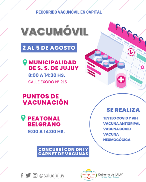 agosto 3, 2022 Compartir en: Compartimos el cronograma con la ubicación y horarios de nuestra unidad para el acceso a la vacunación covid, antigripal, neumocócica y test rápido de VIH. Más historias LOCALES Este miércoles 12 de noviembre se realizará el Operativo Aprender 2025 noviembre 11, 2025 LOCALES Jujuy fue sede del 17° Congreso de Derecho Laboral y Relaciones del Trabajo noviembre 11, 2025 LOCALES Deliberará en Jujuy el Foro de Direcciones de Presupuesto y Finanzas de la República Argentina noviembre 11, 2025