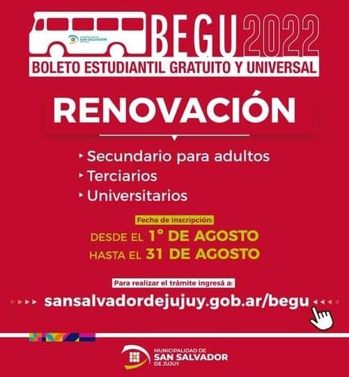 Hasta el 31 de agosto los alumnos del nivel secundario para adultos, terciario y universitario deberán realizar la renovación del beneficio, para ello deberán contar con la tarjeta SUBE registrada a su nombre. El trámite se puede realizar ingresando a la página www.sansalvadordejujuy.gob.ar/begu.