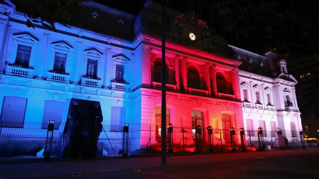 Al conmemorarse el 18 de septiembre un nuevo aniversario de la Independencia de Chile, la fachada de la Casa de Gobierno de la Provincia lució los colores de la bandera chilena.