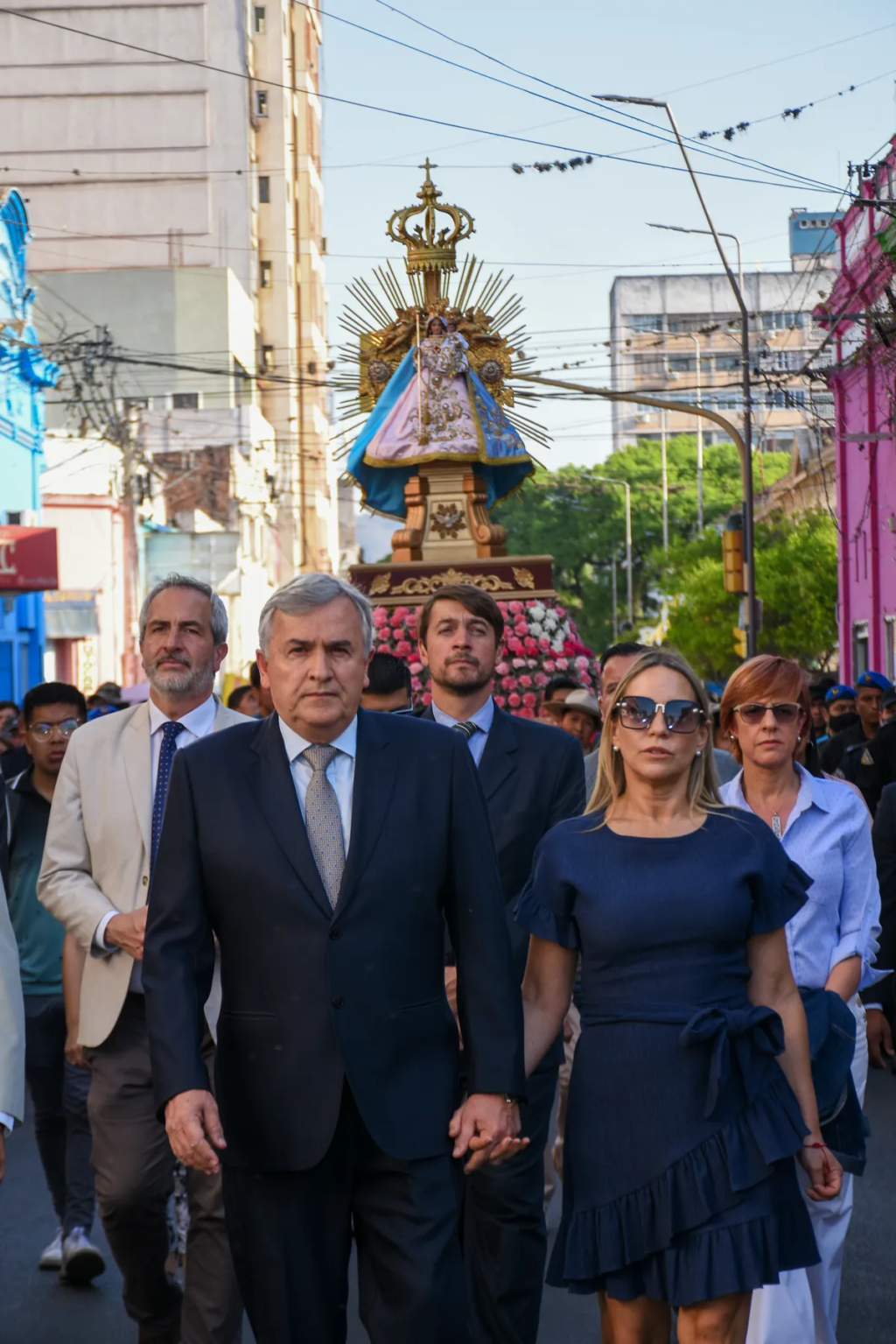 La jornada se inició con una breve ceremonia y la posterior procesión de la Cruz Procesional por calles céntricas, en donde el mandatario y su esposa, junto a autoridades provinciales, municipales y nacionales participaron como abanderados.