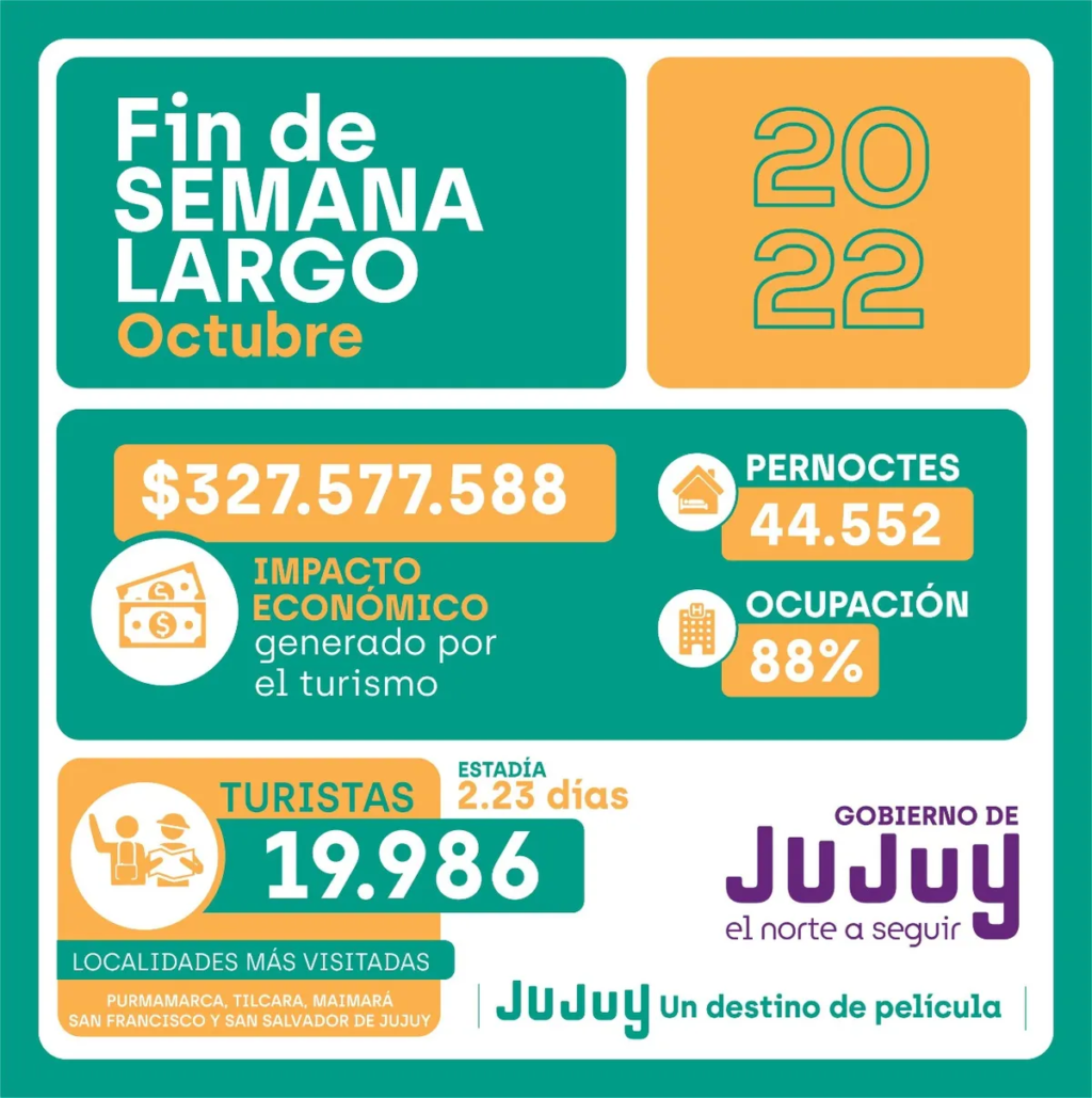 Luego de haber transcurrido el fin de semana XXL del mes de octubre, el impacto económico registrado por el turismo en la provincia ascendió a $327.577.588, registrando una ocupación promedio del 88 por ciento en todo el territorio.
