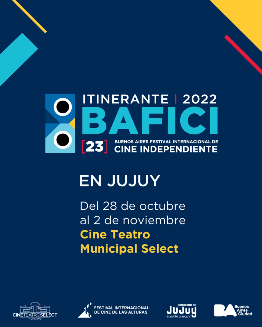 Organizada por el Ministerio de Cultura del Gobierno de la Ciudad de Buenos Aires y el Festival Internacional de Cine de las Alturas, comienza el BAFICI Itinerante del 28 de octubre (el 29 no habrá función) al 2 de noviembre, en San Salvador de Jujuy. Se proyectarán películas en el Cine Teatro Municipal Select, Gral. Alvear 665, de 17 a 20 horas. BAFICI Itinerante tiene como objetivo llevar parte de la programación del festival a otras ciudades de Argentina. Se creó en 1999, con la primera edición del festival, por la necesidad de generar espacios alternativos de exhibición en ciudades de todo el país a las que no llega esa oferta cinematográfica a las carteleras comerciales.