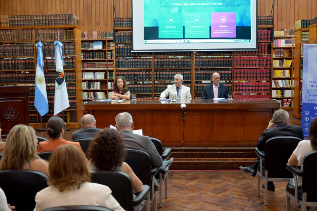 La nueva página web y revista “Diálogos y Voces Jurídicas” de la Escuela de Capacitación Judicial “Dr. Guillermo Snopek” fue presentada este miércoles 15 de noviembre, en el Salón Vélez Sarsfield de Tribunales, mediante un acto encabezado por el presidente del Superior Tribunal de Justicia, Dr. Federico Otaola, y los jueces y directores de la institución, Dr. Ekel Meyer y Dra. María Silvia Bernal.