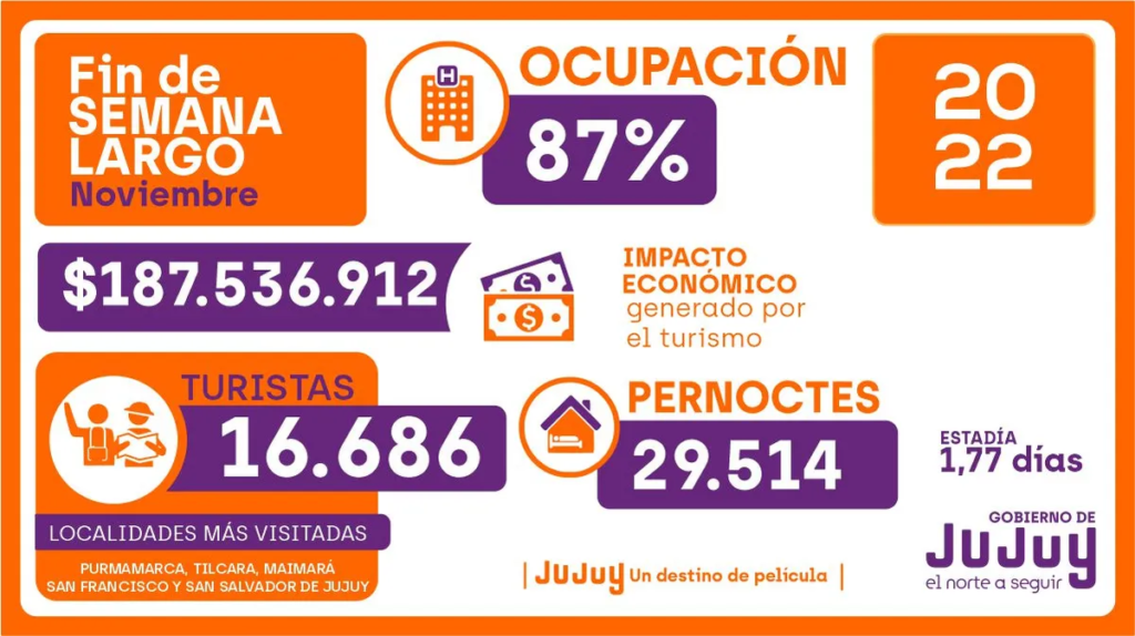Con el 87% de ocupación promedio en la provincia durante el fin de semana largo, comprendido entre los días 19 al 21 de noviembre, Jujuy marcó un nuevo interés por los turistas en visitar la provincia, siendo uno de los destinos más elegidos a nivel país.
