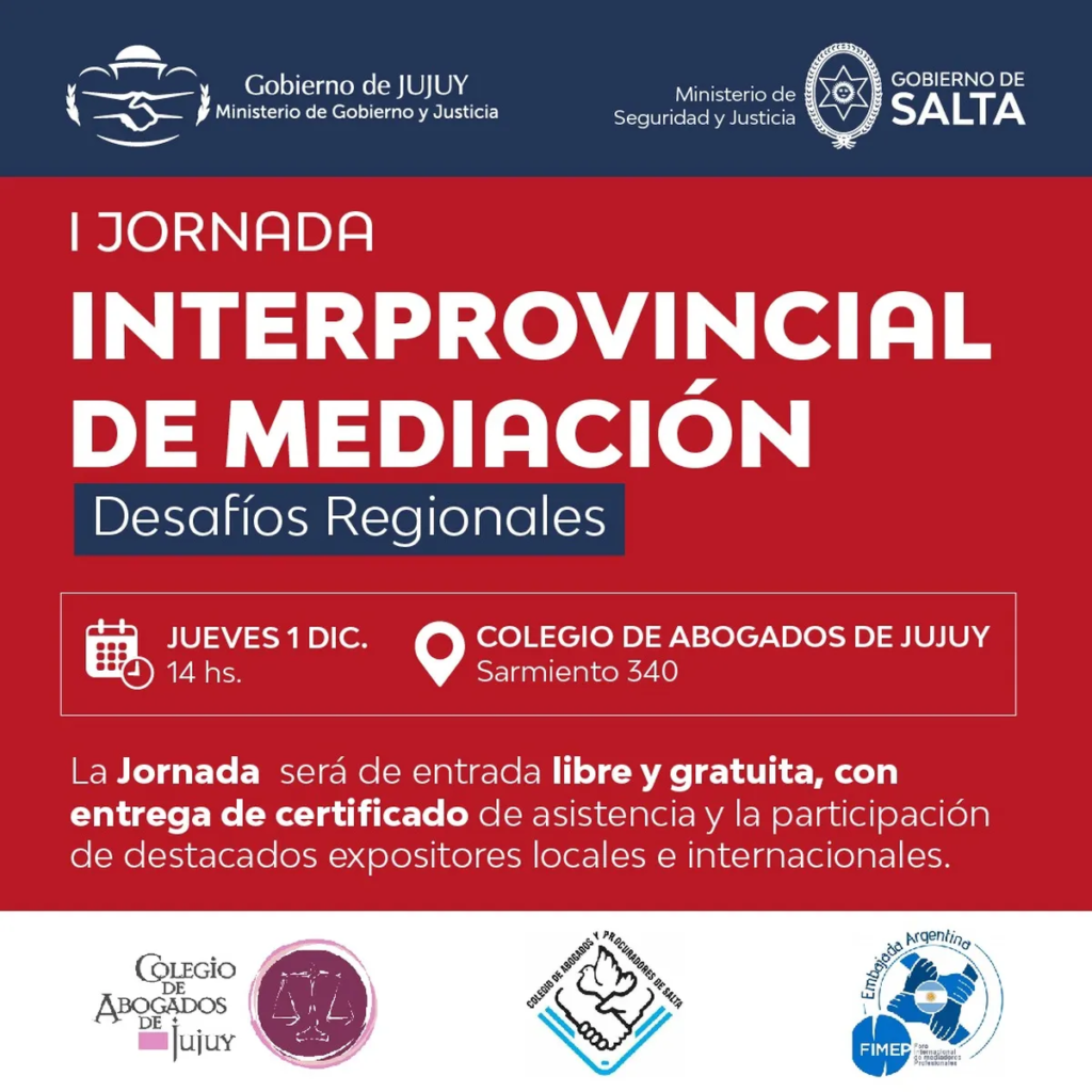 El próximo jueves, 1 de diciembre, se llevará a cabo una jornada abierta de Mediación, con la participación de expertos en la materia de Jujuy, Salta y el exterior.