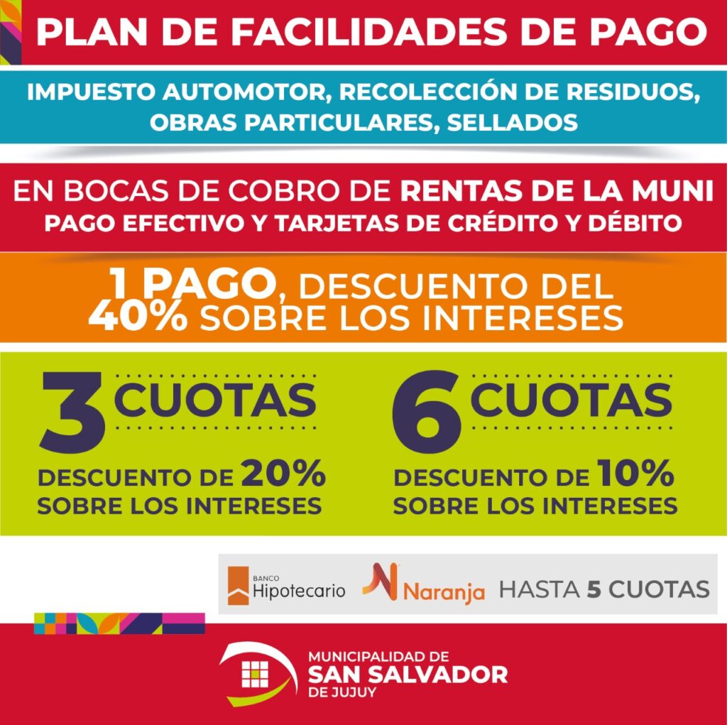 La Dirección General de Rentas de la Municipalidad de San Salvador de Jujuy, recuerda a los vecinos de la ciudad que continúan los beneficios a la hora de abonar los tributos municipales, que pueden llegar hasta el 40% de descuento de los intereses generados. Los contribuyentes pueden acceder a los mismos de manera presencial en las diversas bocas de cobro o desde la comodidad del hogar a través de la página web www.rentasmunijujuy.gob.ar
