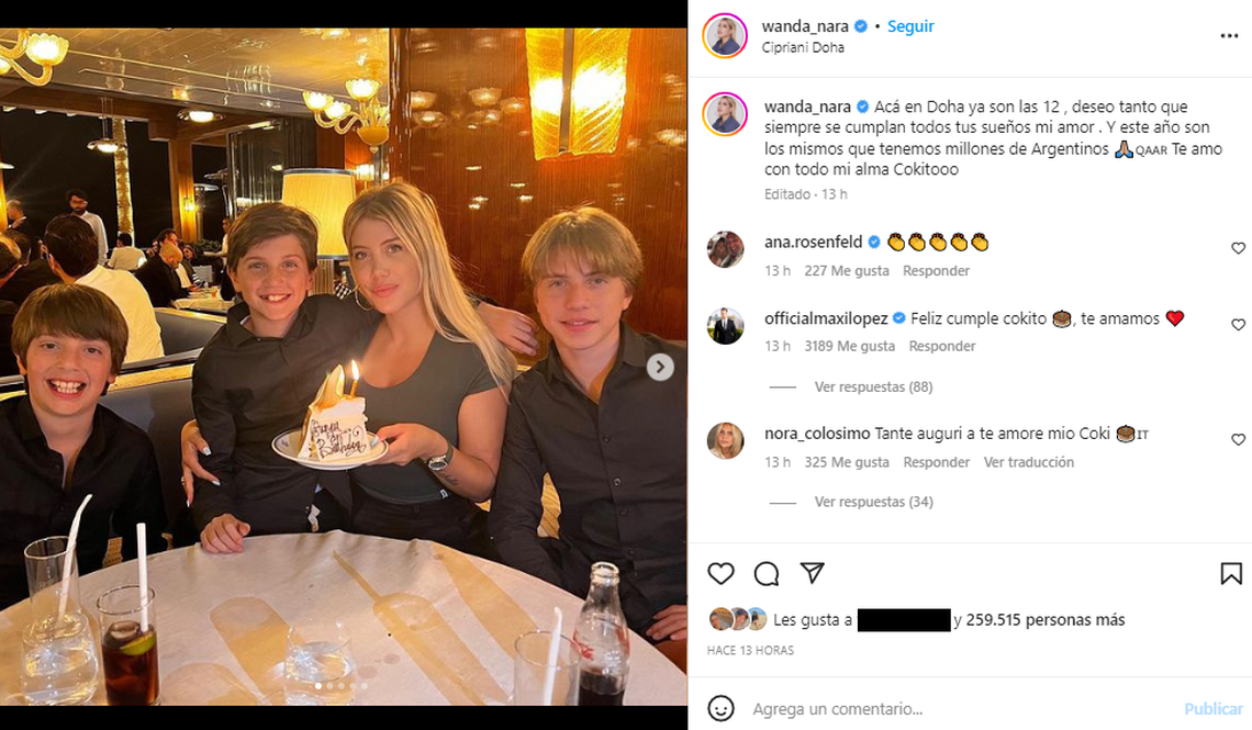Wanda Nara se pudo tomar una foto con la madre de Lionel Messi en el Cipriani Doha porque la mediática modelo fue a festejarle los 12 años a Constantino, su segundo hijo fruto de su matrimonio con Maxi López.