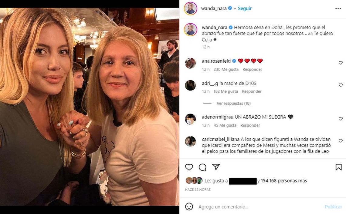 «Hermosa cena en Doha. Les prometo que el abrazo fue tan fuerte que fue por todos nosotros», escribió Wanda al postear la foto de su abrazo con Celia Messi, la madre de Lionel, quien este domingo jugará su probable último partido en un mundial.