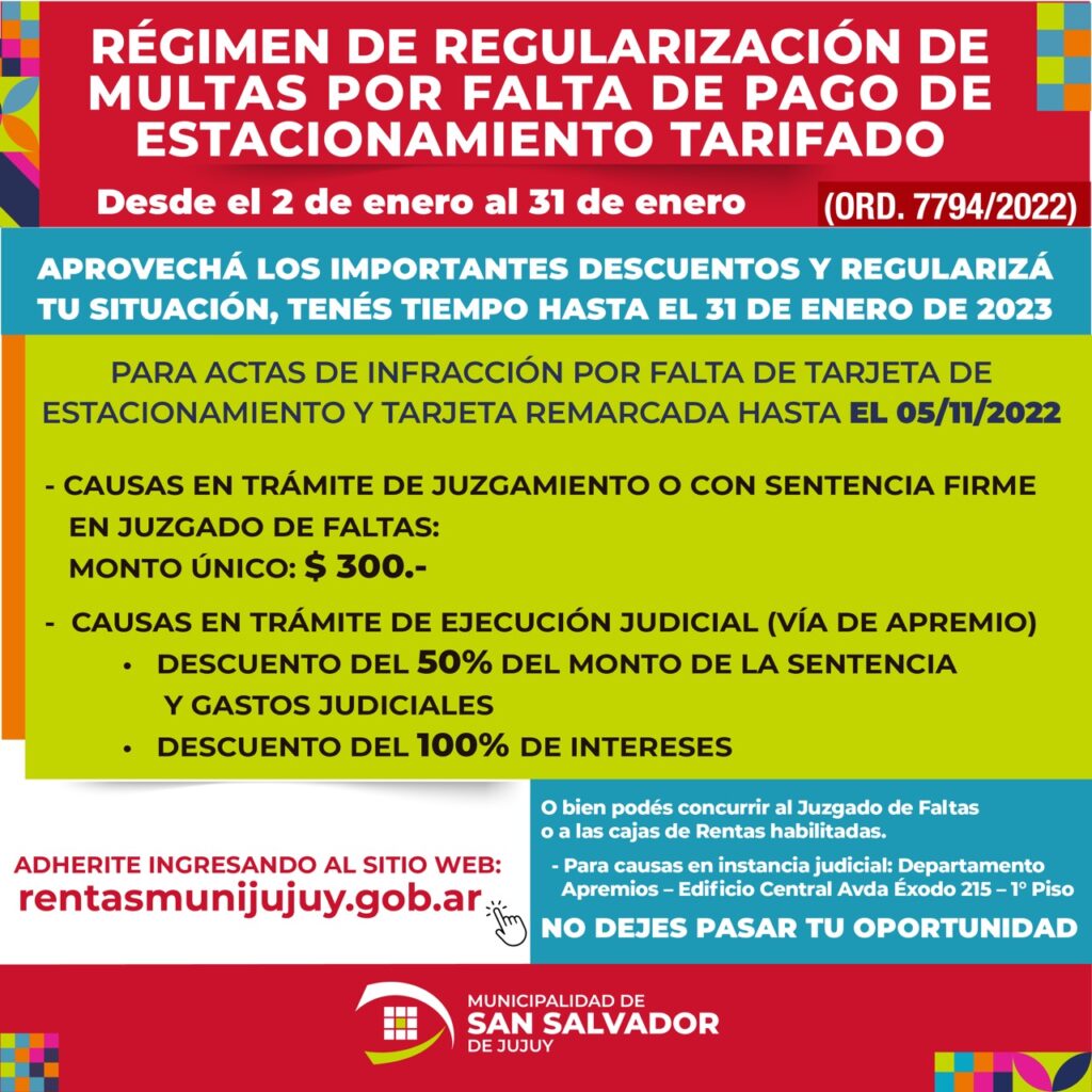 Desde el lunes 2 y hasta el 31 de enero de 2023, se pondrá en vigencia en el ámbito de la Municipalidad de San Salvador de Jujuy el “Régimen de Regularización de Multas por Faltas de Pago de Estacionamiento Tarifado” que se hayan labrados hasta el 5 de noviembre de 2022.