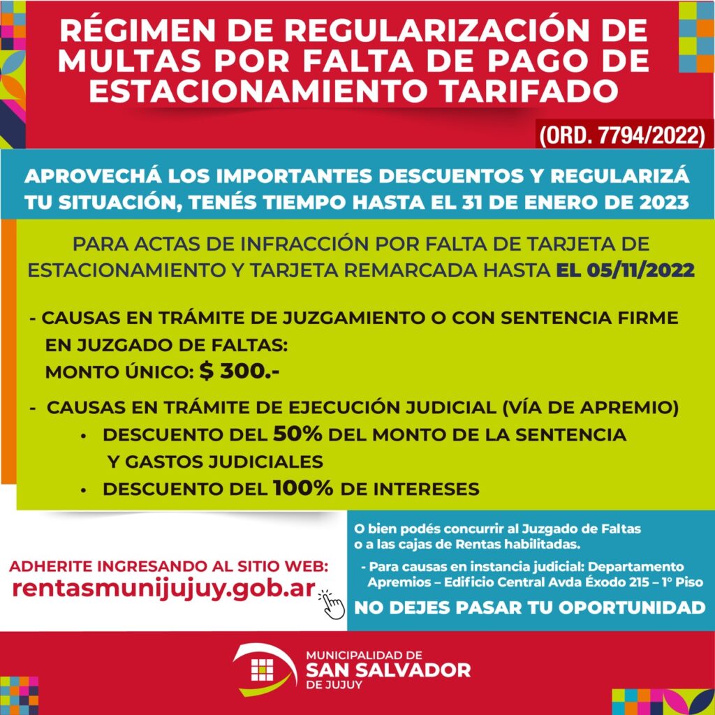 La Municipalidad de San Salvador de Jujuy recuerda a los vecinos y contribuyentes que sigue vigente hasta fin de mes la Moratoria 2023 para la regularización multas por estacionamiento.