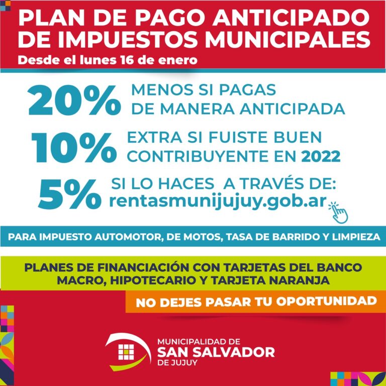 Los interesados pueden acceder al beneficio del 20 % en el pago anual anticipado del Impuesto Automotor, Impuesto de Motos, Tasa de Recolección de Residuos y más. A esto, en el caso de quienes fueron “Buen contribuyente” durante 2022 pueden adquirir un 10% más y para evitar aglomeraciones se puede realizar el pago de manera online ingresando a: rentasmunijujuy.gob. ar, sumando un 5% extra de descuento.