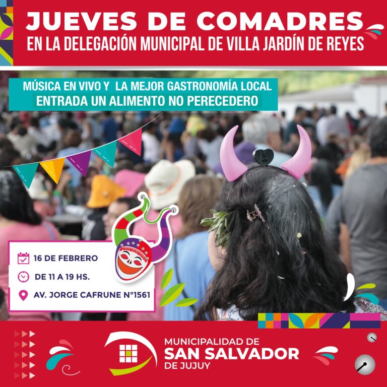 El tradicional “Jueves de Comadre” se realizará como cada año en el tinglado de la institución Delegación Municipal de Villa Jardín de Reyes d e avenida Jorge Cafrune N° 1561 el jueves 16 de febrero de 11 a 19 hs.