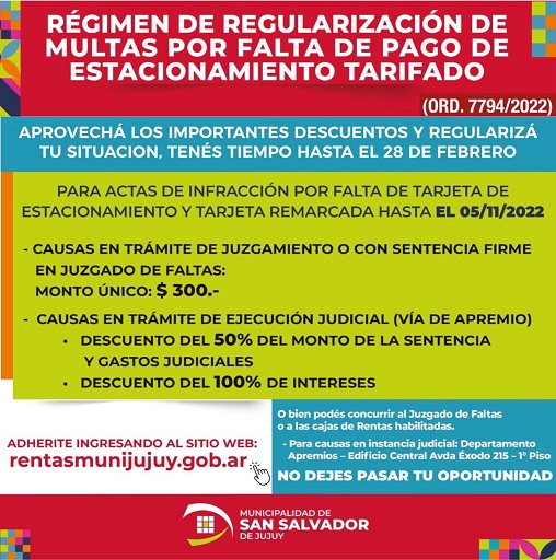 Los contribuyentes pueden adherir a esta moratoria, que alcanza a las infracciones labradas hasta el 5 de noviembre de 2022, a través del sitio web: www.rentasmunijujuy.gob.ar.