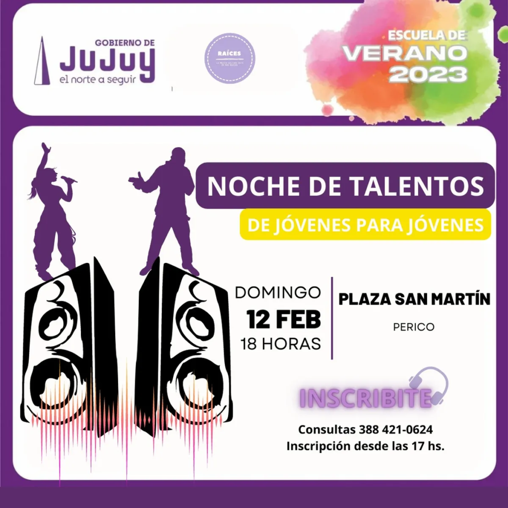 El Ministerio de Desarrollo Humano junto a la Fundación Raíces invita a la comunidad a participar de “La Noche de Talentos” para jóvenes y adolescentes de la ciudad de Perico a realizarse el día Domingo 12 de febrero desde las 18 horas en la Plaza San Martín.