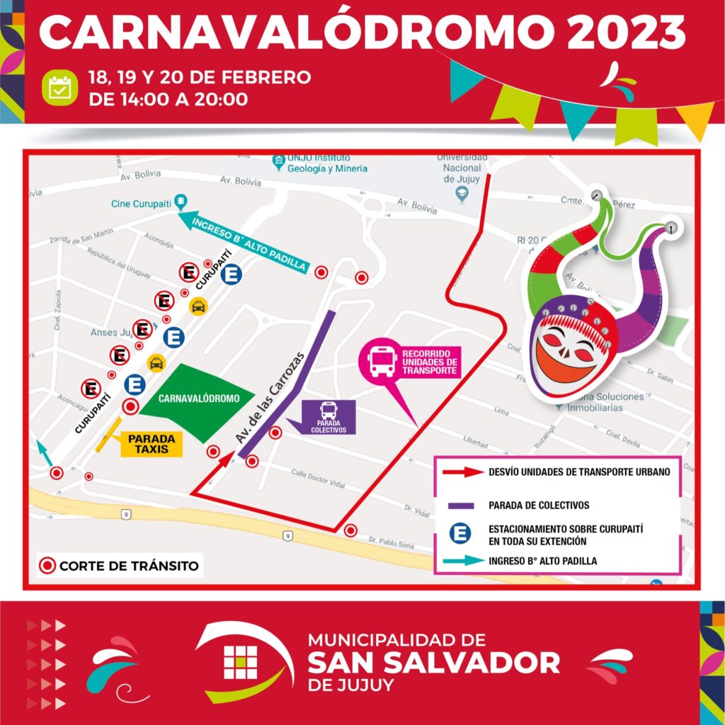 La Dirección de Tránsito y Transporte, dependiente de la Secretaría de Servicios Públicos de la Municipalidad de San Salvador de Jujuy, informó las medidas de tránsito dispuestas por la realización del Carnavalodromo los dias 18, 19 y 20 de febrero de 14 a 20 hs y Carnaval de los Tekis , los días 17, 18, 19 y 20 de febrero de 20 a 5.30 hs.