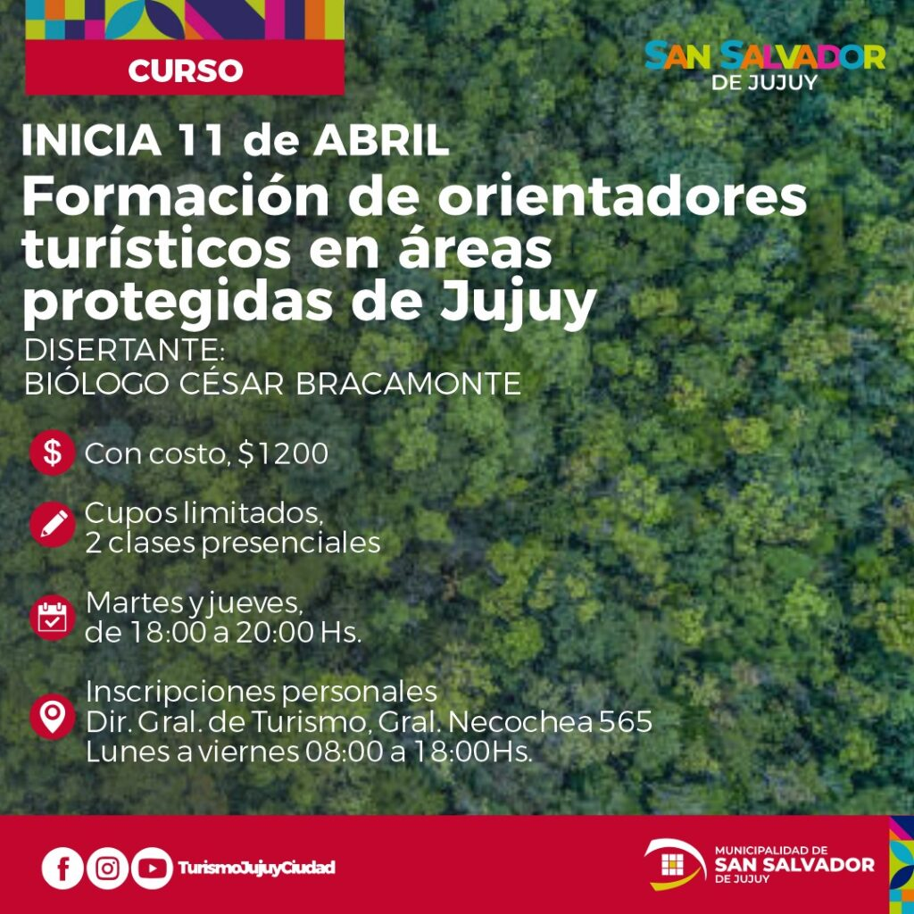 - Curso de “Formación de Orientadores Turísticos en Áreas Protegidas de Jujuy”, a cargo del biólogo Cesar Bracamonte, inicia el martes 11 de abril y jueves 13 (2 clases) de 18 a 20 hs. con un costo de 1.200 pesos.