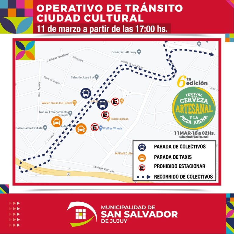 En este sentido, la Secretaría de Servicios Públicos, a través de la Dirección de Tránsito y Transporte, informó que en razón de llevarse a cabo el próximo sábado 11 de marzo, el tradicional Festival de la Cerveza Artesanal y la Pizza Jujeña en Ciudad Cultural, ha dispuesto que las líneas del transporte urbano de pasajeros afecten su recorrido llegando hasta el lugar del evento donde se hallarán paradas debidamente identificadas para cada una de ellas.