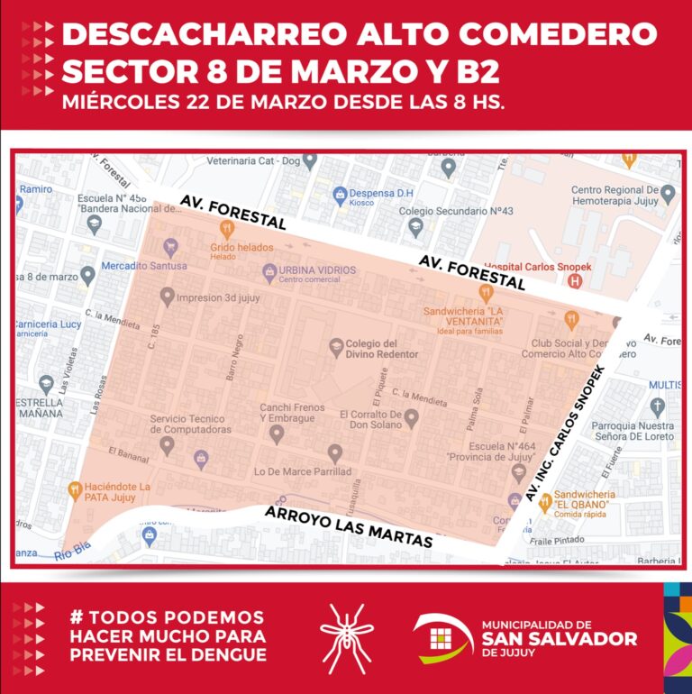 A partir de las 8 hs., operarios de la Delegación municipal dependientes de la Secretaría de Gobierno de la municipalidad con apoyo de maquinaria pesada y camiones, realizarán un operativo de descacharreo preventivo del dengue en el sector del barrio 8 de Marzo y B2, con lugar de encuentro en la esquina de avenida Forestal y Teniente López.