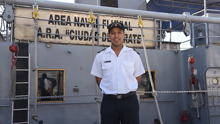 Desde adolescente, Diego Sebastián Juárez tenía decidido su ingreso a la Armada Argentina; hoy con 26 años, está orgulloso de su carrera. Es Cabo Primero de Mar y se encuentra destinado en el multipropósito ARA «Ciudad de Zárate», que cumple 24 años desde la afirmación de su pabellón.