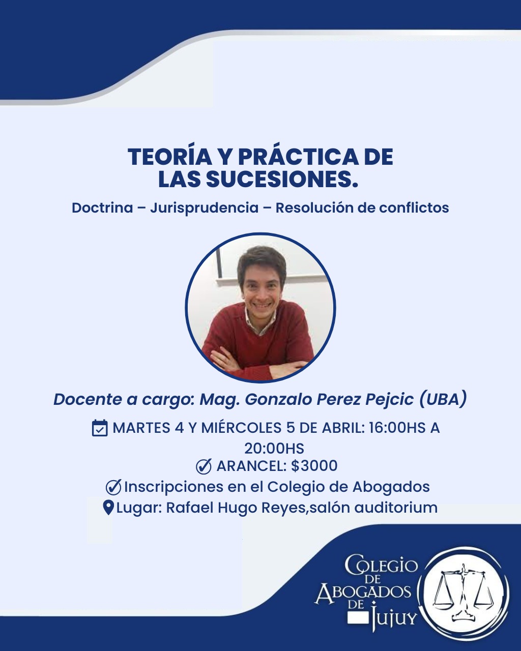Organizado por el Colegio de Abogados de Jujuy (CAJ), los días 4 y 5 de abril próximos tendrá lugar el curso denominado «Teoría y Práctica de las Sucesiones: doctrina, jurisprudencia y resolución de conflictos», a cargo del docente de la Universidad de Buenos Aires (UBA), Mg. Gonzalo Pérez Pejcic, y destinado a los y las profesionales de la matrícula. El mismo se desarrollará durante dos clases en el horario de 16 a 20 horas en la sede central de la entidad, ubicada en Sarmiento 340 de San Salvador de Jujuy.