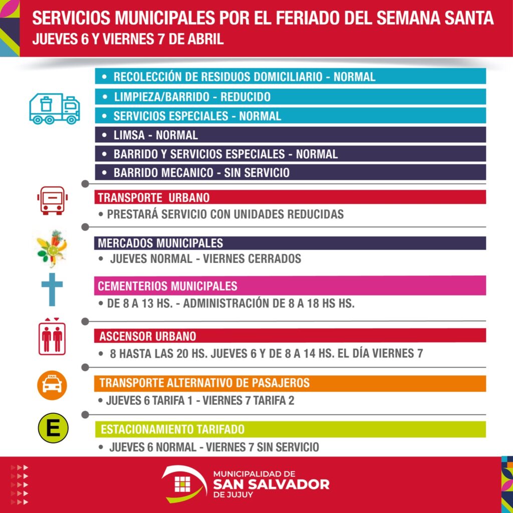 La Municipalidad de San Salvador de Jujuy informó la modalidad de prestación de los servicios municipales los días jueves 6 de abril (no laborable) y viernes 7 de abril ( feriado nacional).