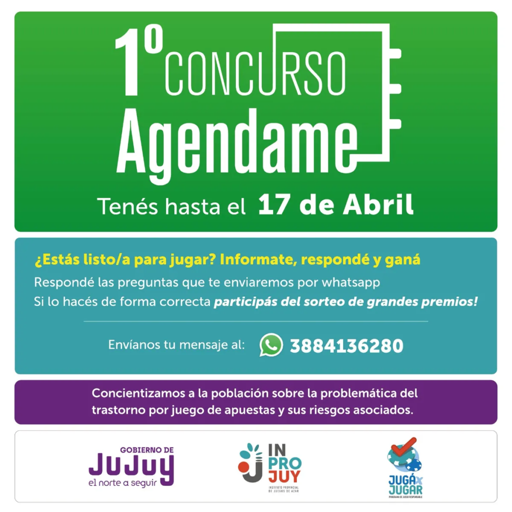 En el caso de “AGENDAME”, puede sumarse toda la comunidad, enviar un WhatsApp al 3884136280, en donde deberán esperar a que le asignen una pregunta, responder y si lo hace de manera correcta, pasa a formar parte del grupo de personas que participará del sorteo de premios. Cabe destacar que la pregunta para competir siempre gira en torno a la temática del juego responsable, y en el caso de no responder bien, la idea es explicarle la respuesta correcta de esta forma se informa sobre la problemática.