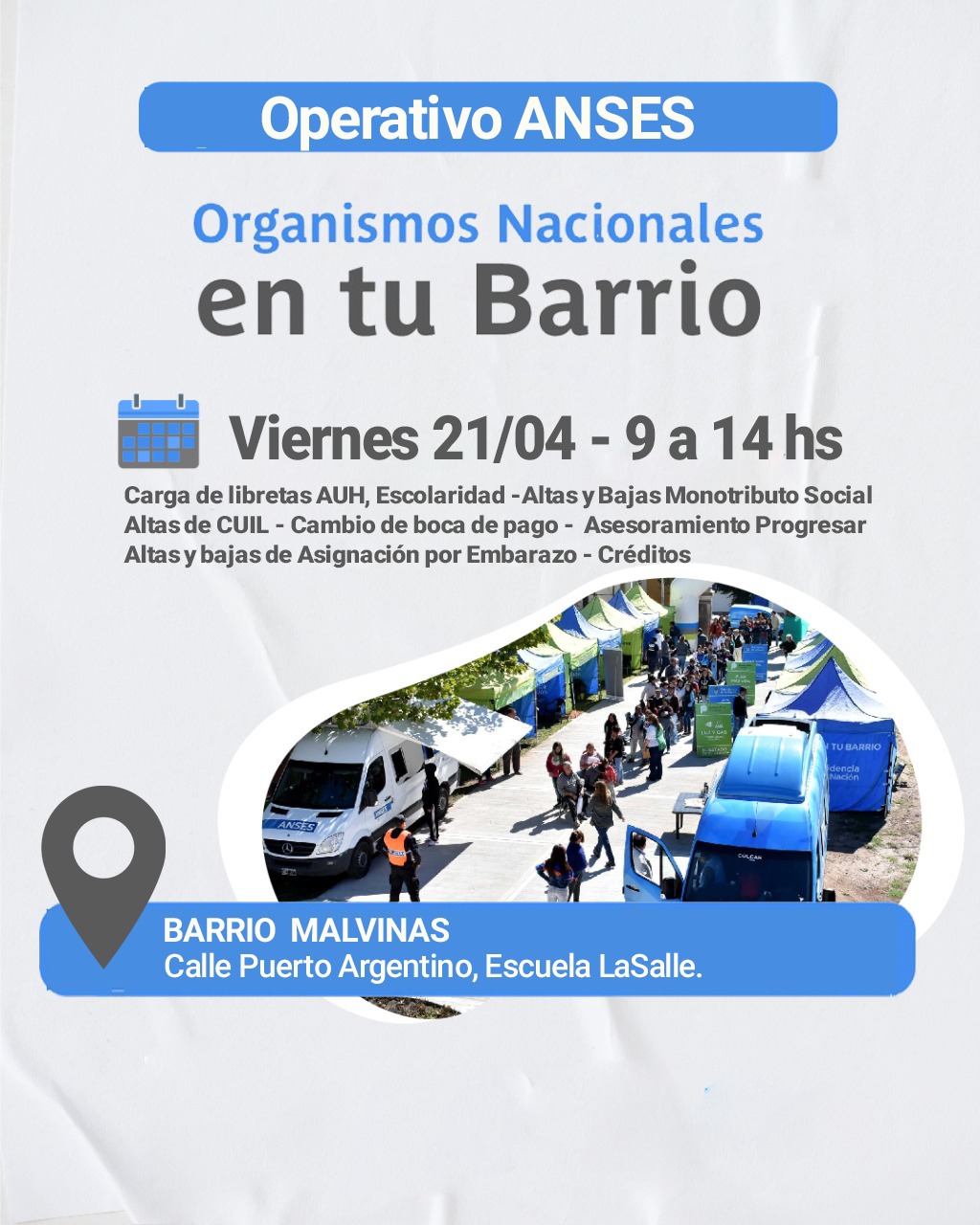 De esta manera los vecinos y vecinas de la capital jujeña podrán acceder a las garrafas sociales que otorga la Secretaría de Energía de la Nación, como así también podrán realizar distintos trámites de ANSES como ser: cargas de libreta de la Asignación universal por Hijo; altas y bajas del Monotributo Social; altas de CUIL; cambios de boca de pago; asesoramiento para acceder al PROGRESAR; altas y bajas de Asignación por Embarazo; créditos; etc.