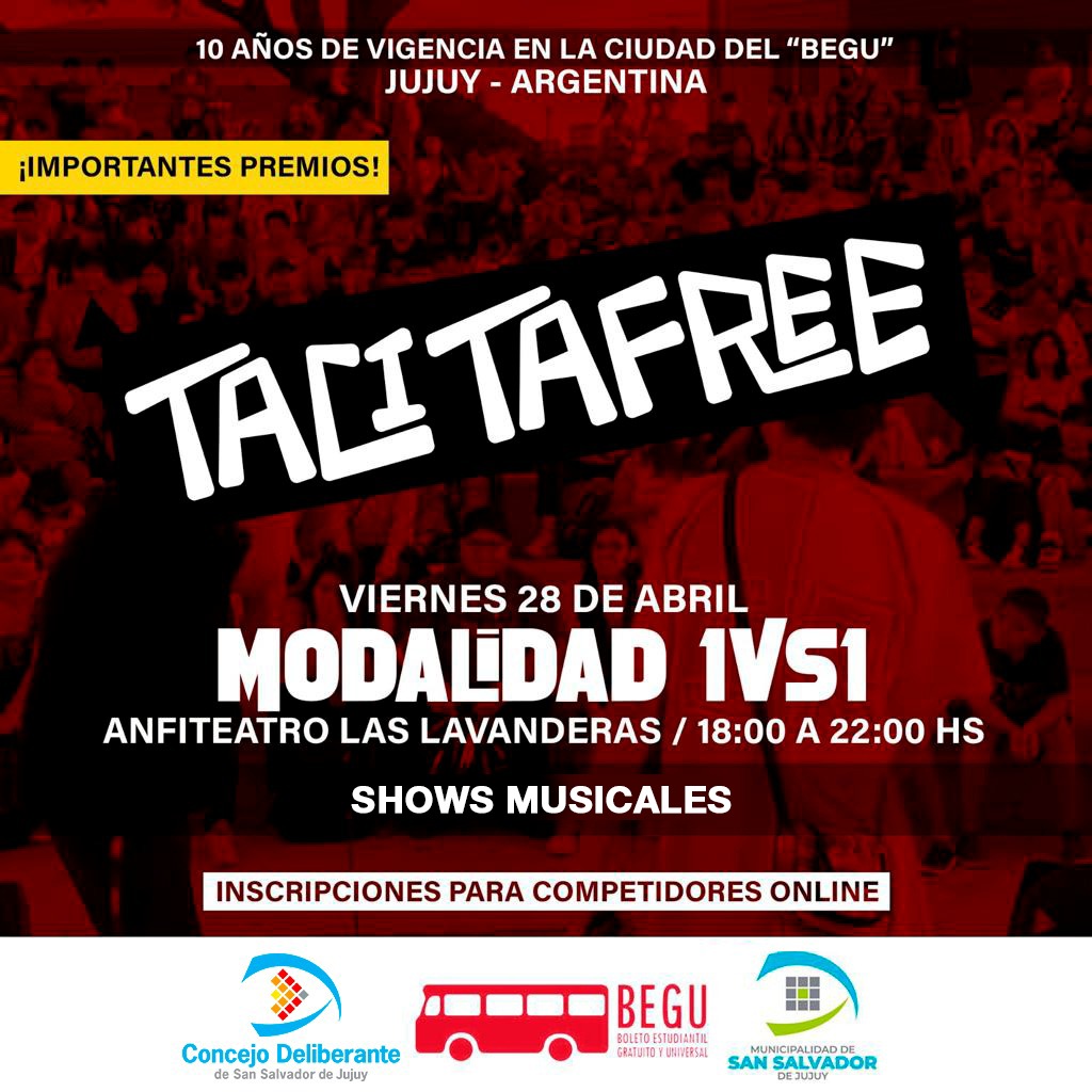 El encuentro de “TacitaFree”, que convoca a jóvenes artistas para demostrar en diferentes estilos, sus habilidades en el rap, se realizará el viernes 28 de abril en el anfiteatro de Las Lavanderas del Parque Xibi Xibi de 18 a 22 horas; actividad que se suma a la celebración del X° aniversario de vigencia del BEGU municipal.