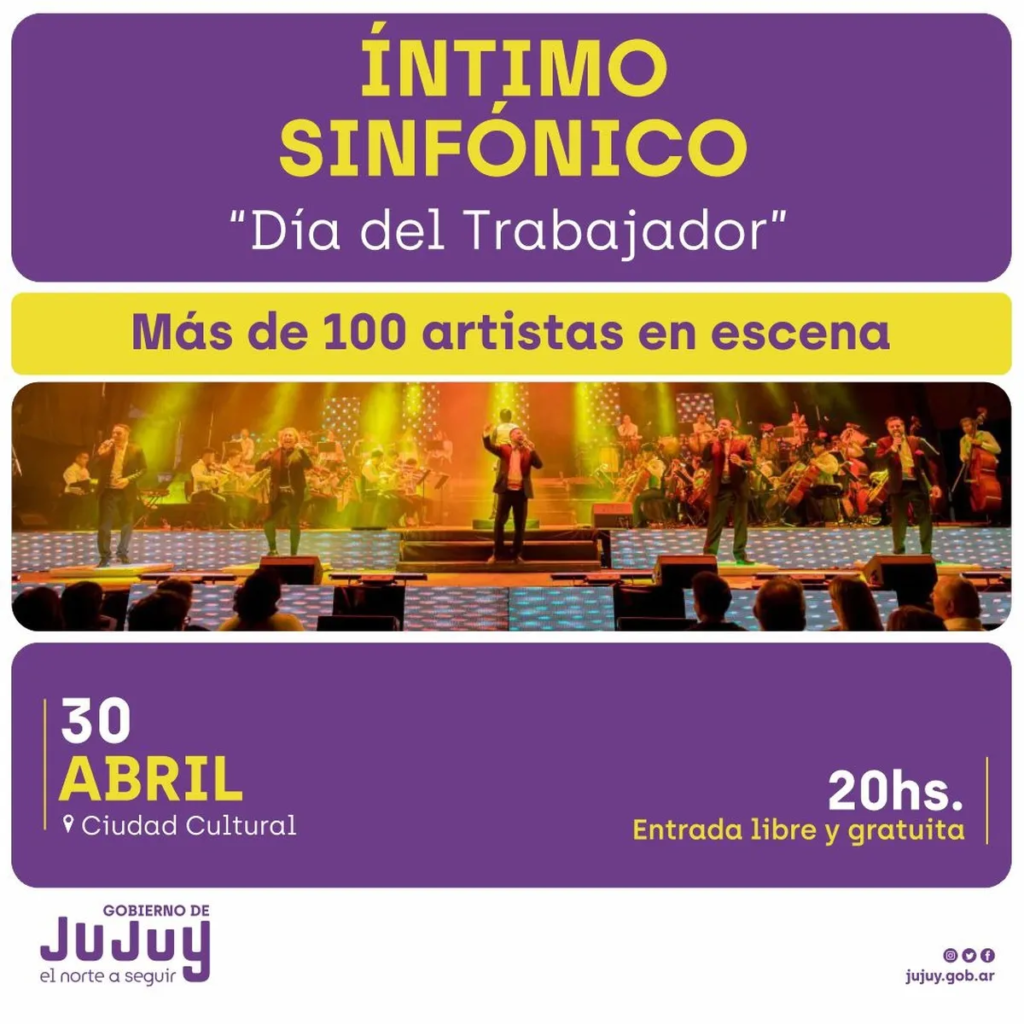 La Secretaría de Cultura dependiente del Ministerio de Cultura y Turismo, invita a la comunidad en general a participar del espectáculo “Intimo Sinfónico”. Este evento con entrada libre y gratuita, se realizará el próximo domingo 30 de abril a las 20:00hs. en la Ciudad Cultural de San Salvador de Jujuy.