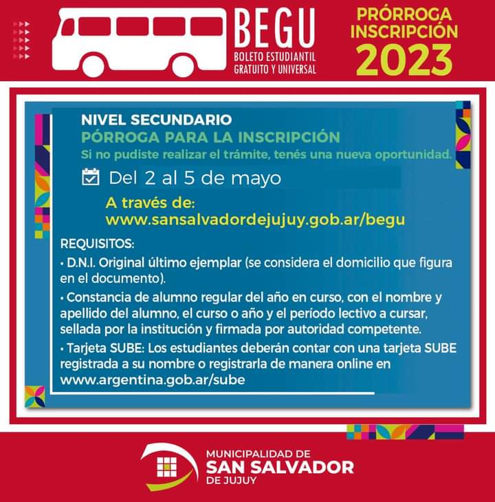 La Municipalidad de San Salvador de Jujuy prorrogó desde el martes 2 de hasta el viernes 5 de mayo la inscripción del BEGU para todos los estudiantes del nivel secundario. Los beneficiarios pueden hacerlo a través de la página web del municipio: www.sansalvadordejujuy.gob.ar