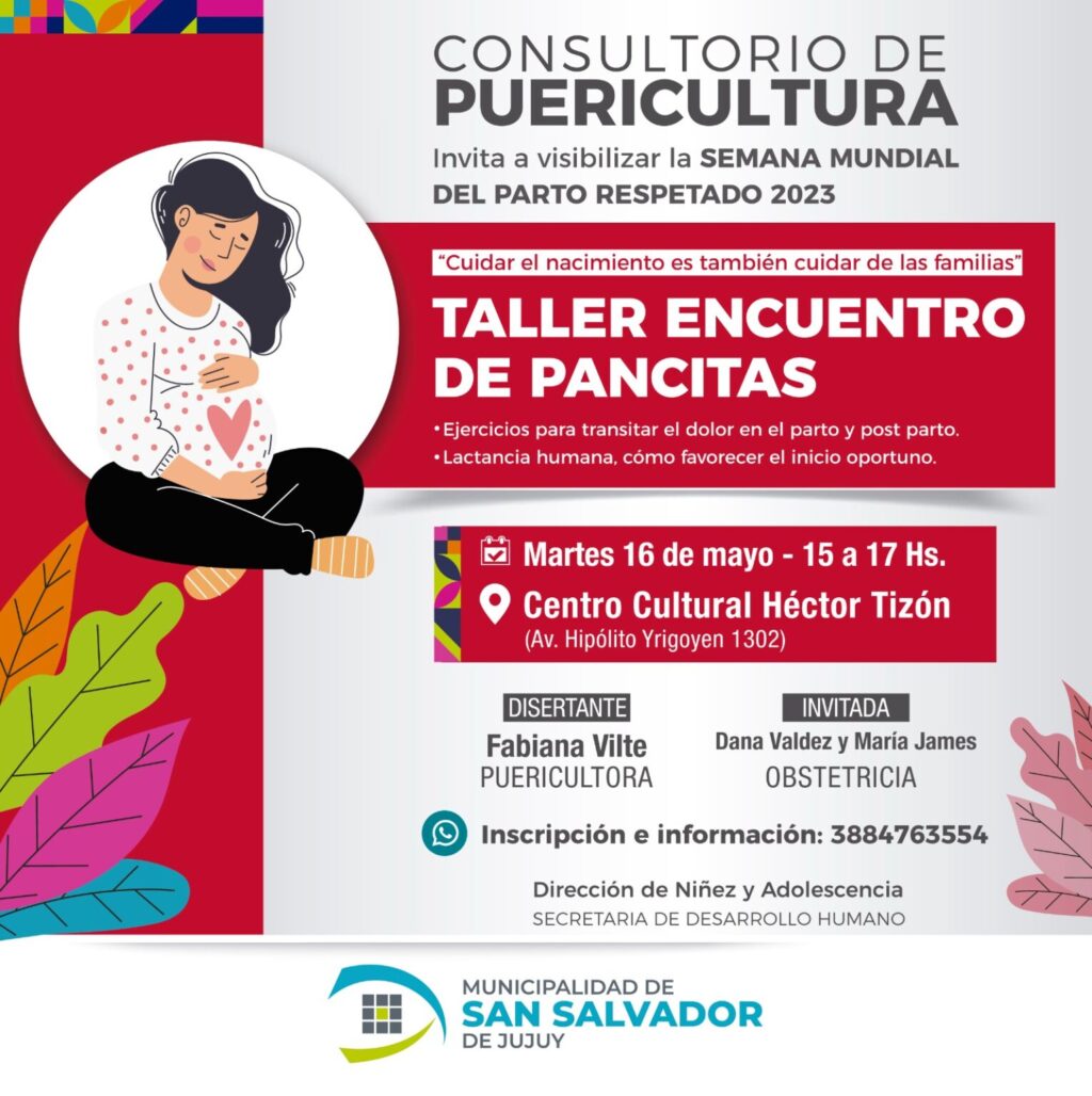 La Municipalidad de San Salvador de Jujuy invita a visibilizar la Semana Mundial del Parto Respetado, a través del dictado de un nuevo taller gratuito denominado: ” Cuidar el nacimiento es también cuidar a las familias”, que se llevará a cabo este martes 16 de mayo de 15 a 17 hs en el Centro Cultural “Héctor Tizón”, mediante inscripción al número 3884763554.