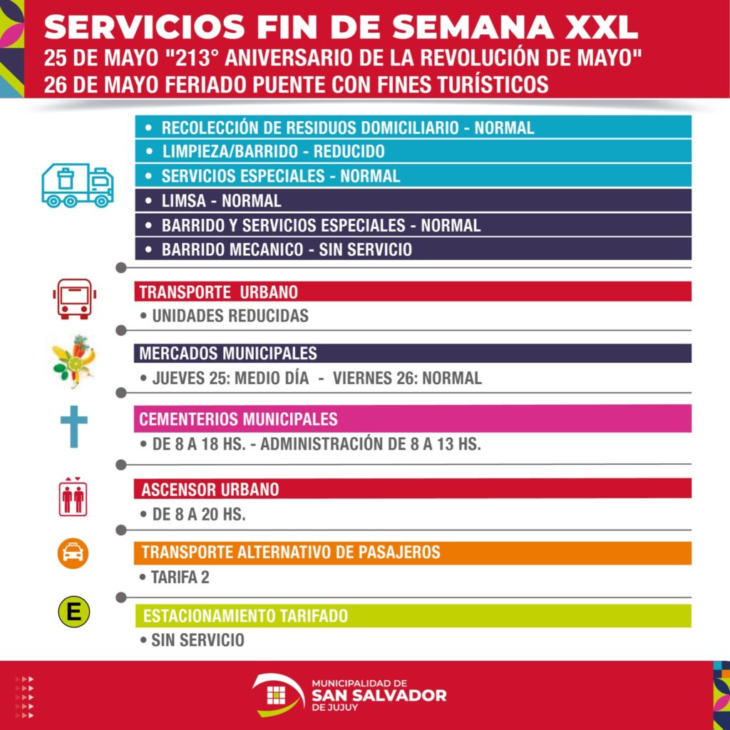 La Municipalidad de San Salvador de Jujuy informó la modalidad de prestación de servicios municipales los días jueves 25 y viernes 26 de mayo, en conmemoración al 213° Aniversario de la Revolución de Mayo y Feriado Puente con fines turísticos días respectivamente.