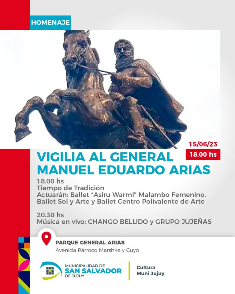 El municipio capitalino se prepara para llevar a cabo la tradicional vigilia en conmemoración al General Manuel Eduardo Arias que tendrá lugar el día 15 de junio en el Parque General Arias con un acto central a las 20.30. Música y ballets amenizarán la jornada que dar inicio a las 18 hs. con la propuesta Tiempo de Tradición.