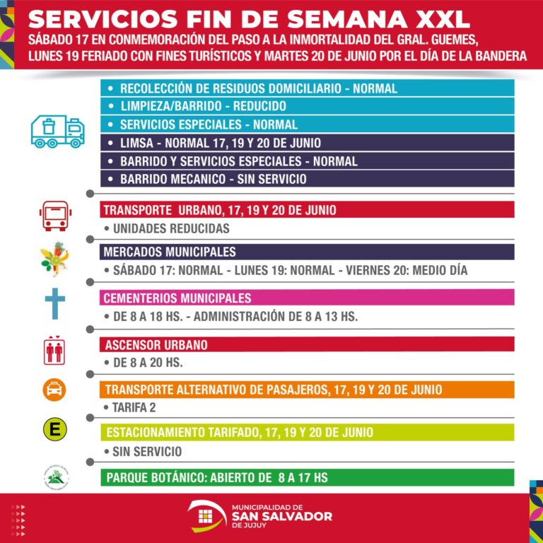 La Municipalidad de San Salvador de Jujuy informó la modalidad de prestación de servicios municipales los días sábado 17 en conmemoración del Paso a la Inmortalidad del Gral. Guemes;, lunes 19 feriado con fines turísticos y martes 20 de junio por el Día de la Bandera.