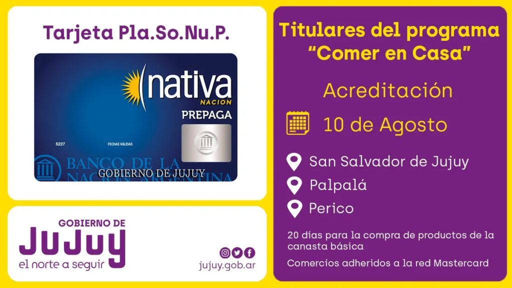 Cabe mencionar que la Tarjeta PLASONUP se acreditó con el monto de $ 5.000, y se implementó en las localidades de Capital, Palpalá y Perico, para titulares del programa «Comer en Casa”, que pertenece al Plan Social Nutricional Provincial.