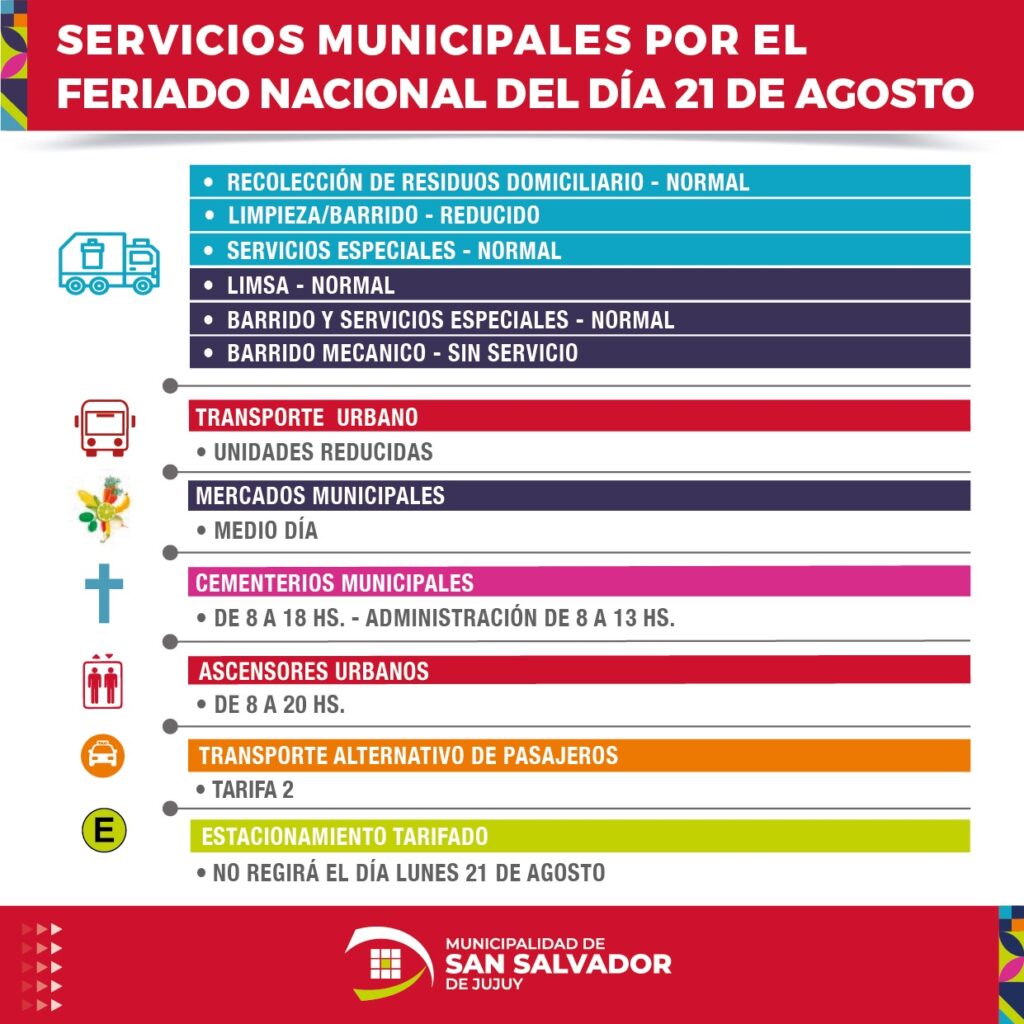 El feriado del 17 de agosto por el Paso a la Inmortalidad del General José de San Martín, se traslada al lunes 21. Por tal motivo, la Municipalidad de San Salvador de Jujuy, a través de las distintas Secretarías, comunicó cómo llevarán adelante las diferentes actividades durante esa jornada.